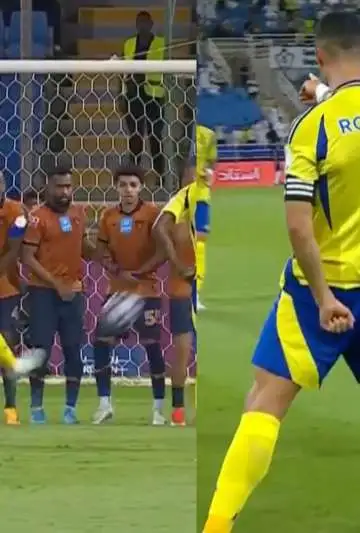 Al Nassr iba ganando 1-0 cuando a los 54 minutos se dio una inmejorable oportunidad para CR7. Se paró delante de la pelota y le pegó perfecto, simple, por arriba de la barrera, para sorprender al portero rival, que pese a su volada no pudo evitarlo.