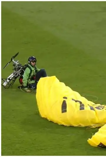 Su paracaídas se enganchó con la cámara aérea y dejó de responderle. Al perder el dominio del mismo, estuvo al borde de chocarse a toda velocidad contra una de las plateas del estadio pero pudo cambiar la dirección a tiempo y cayó en el campo de juego.