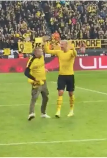 Borussia Dortmund le ganó 3-1 al Mainz 05 con dos goles de Erling Haaland, que volvió a jugar un partido luego de 27 días inactivo por un desgarro muscular. Y tras el encuentro, el equipo alemán hizo su histórico saludo a la hinchada, pero con una particularidad: un hincha saltó al campo y fue directo a Haaland.