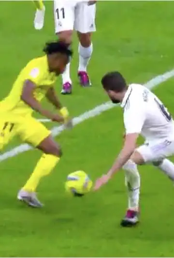 Al minuto 39, con el Real Madrid en ventaja por el gol de Pau Torres en contra, el Villarreal armó una gran jugada que terminó en un pase cortado de Lo Celso y quedó solo Chukwueze contra Nacho.