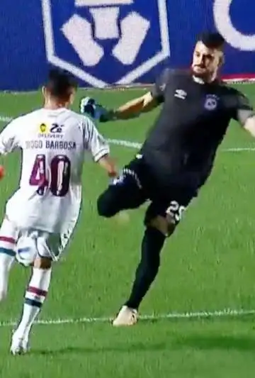 No se sabe bien, pero seguramente el portero de Argentino Juniors, Alex Arias (25), quiso "vengar" a su compañero Sánchez, y en un avance de Fluminense en los pies de Diogo Barbosa (40), el portero le salió con todo y lo derribó tras un duro golpe.