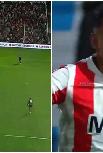 Tras un tiro libre que casi termina en gol de los de Diego Dabove, Franco Armani salió jugando de abajo, pero Rodrigo Villagra la perdió rápidamente y le regaló el balón a Facundo Suárez que terminó recibiendo la infracción del propio Villagra. El árbtiro Silvio Trucco no dudó y cobró penal en favor de La Gloria.