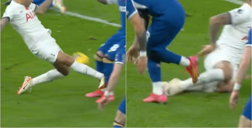 El defensor del Tottenham le fue con todo al mediocampista del Chelsea y vio la tarjeta roja por esa tremenda patada, que además, terminó en penal para el Chelsea.