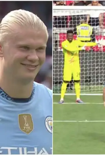 El delantero noruego pateó el tercer penal del Manchester City y se encontró con André Onana, quien lo desafío delante de todos. El arquero del United se paró a un costado del arco y abriendo los brazos le propuso patear cruzado, dejándole todo ese espacio libre.