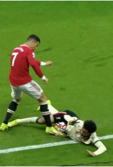 En una de las últimas jugadas del primer tiempo, Curtis Jones, defensor del Liverpool, se la quiso pisar a Cristiano Ronaldo y el portugués no lo soportó. Jones cayó al suelo y el balón quedó justo en el abdomen del jugador del Liverpool y Cristiano aprovechó para meter un derechazo que dolió.