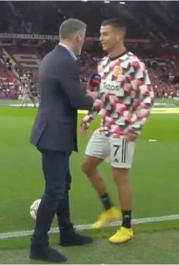 Cuando Manchester United salió a calentar al Old Trafford, Sky Sports News tenía al borde del campo a sus comentaristas: Roy Keane, Gary Neville y Jamie Carragher. Cristiano se percató de esto, se acercó y solamente saludó a Neville y Roy Keane, ambos ex futbolistas del Manchester United.