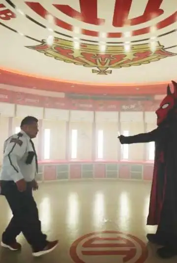 Tras varios momentos de misterio y tensión, tanto el vigilante como el Diablo terminan dialongando de manera amistosa en uno de los banquillos del vestuario.