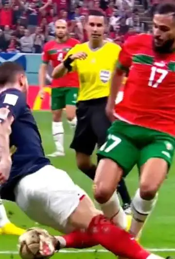 En la otra semifinal, Marruecos puso en aprietos al actual campeón Francia durante buena parte del primer tiempo y hasta mereció empatar, si le hubieran cobrado este penal clarísimo penal de Theo Hernández a Sofiane Boufal. El defensa galo se lo lleva puesto y el marroquí cae en el área, pero el árbitro no tuvo mejor idea que amonestar incluso a Boufal.