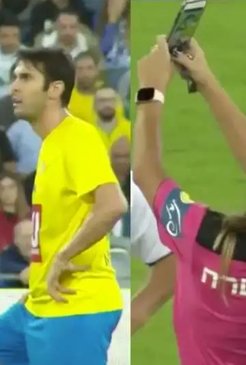 En un partido exhibición de exjugadores de Brasil e Israel, la árbitra del partido paró el partido en plena carrera de Kaká y amonesta al jugador que brilló en Milan y Real Madrid para sorpresa de este.